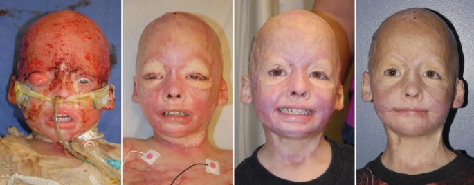 What makes this case so remarkable is that multiple dermatology and burn specialists recommended debridement (cutting away the dead skin) as well as skin grafting - the harvesting of healthy skin from a donor site, such as the thigh, or back, to place over the burned areas of the face.